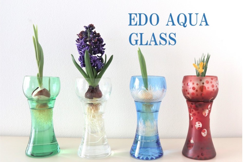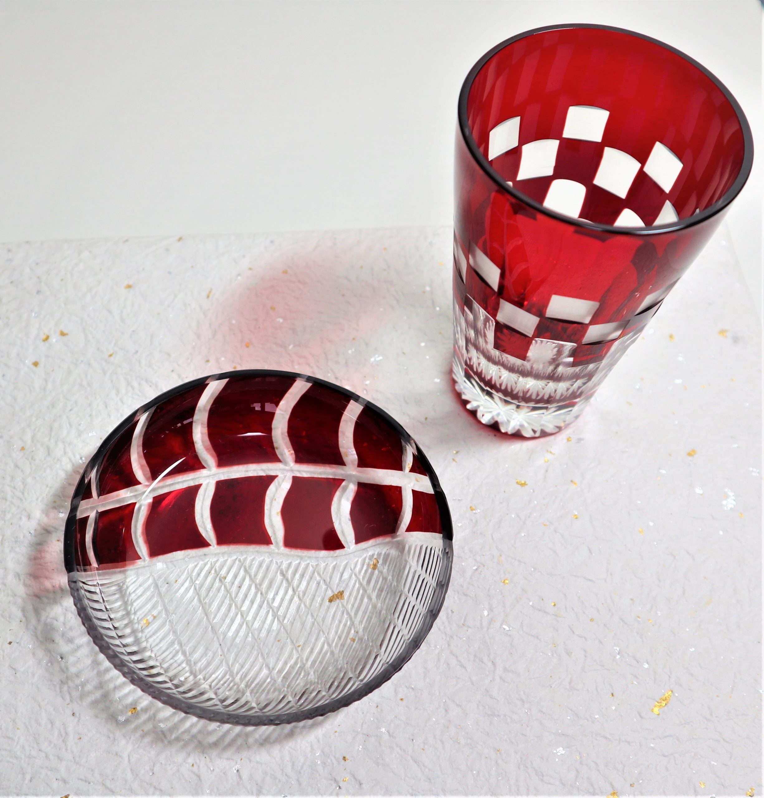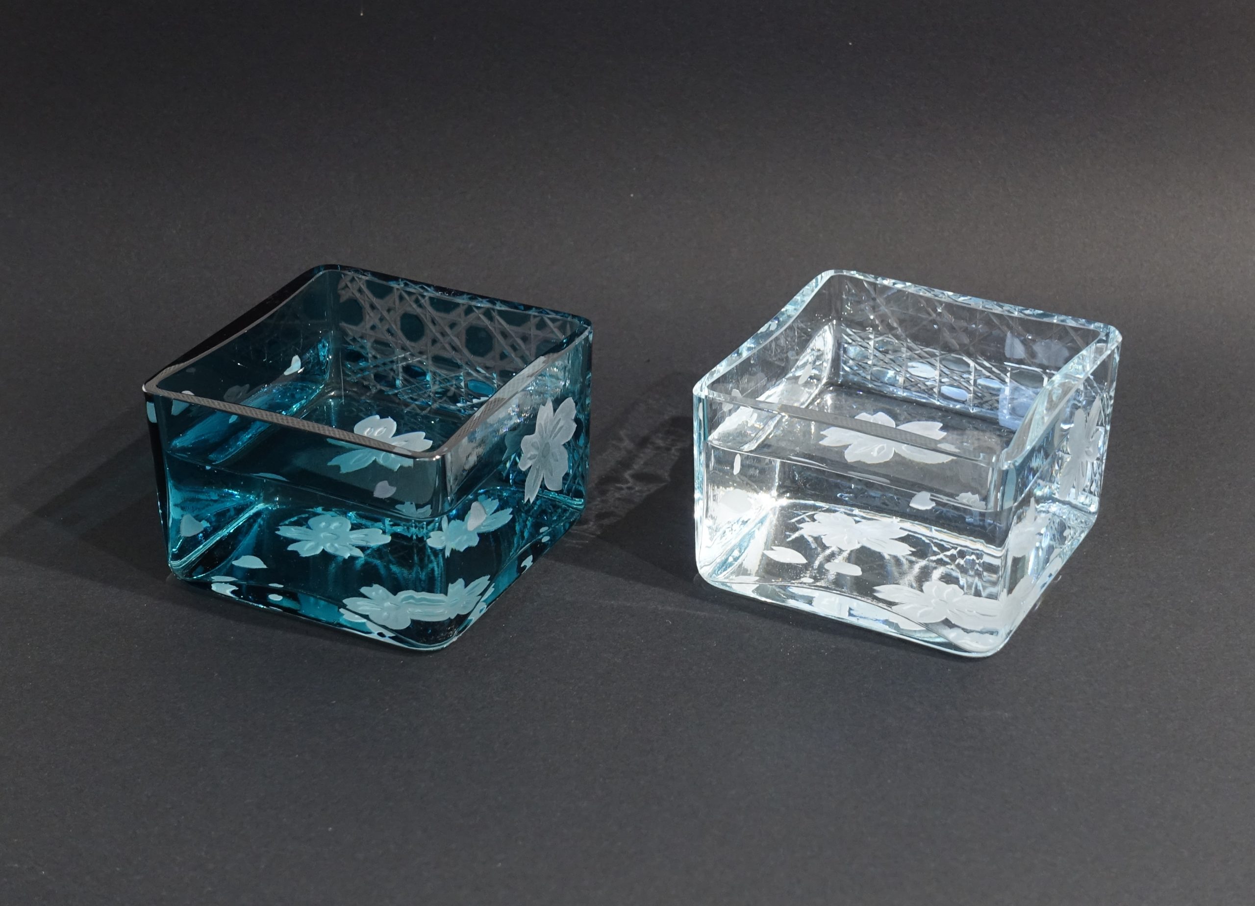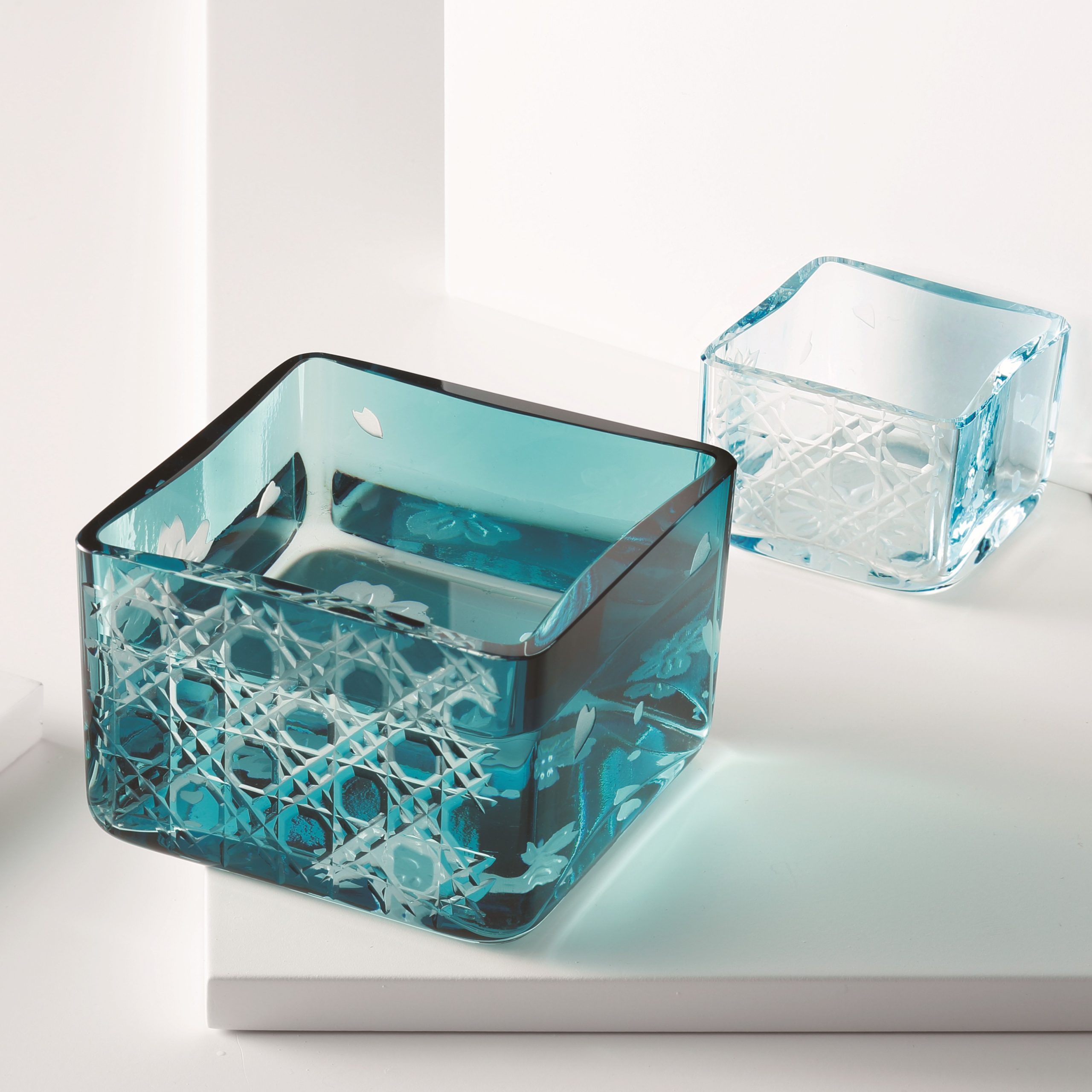 端材から生まれた新しい色<翠>を纏い、 吹いてつくる江戸硝子の技法で仕上げた桝の形のグラスです。
